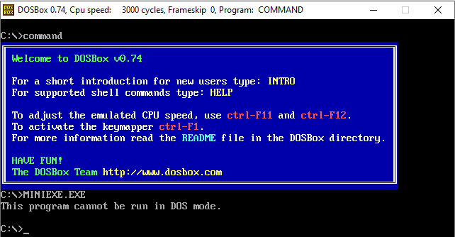If you want to see the result of executing the DOS stub part (If you don't believe me!), you need to have MS-DOS or you can install DOSBox and execute miniexe.exe file in it. The image below shows the result of executing miniexe.exe (32-bit exe file) in DOSBox!