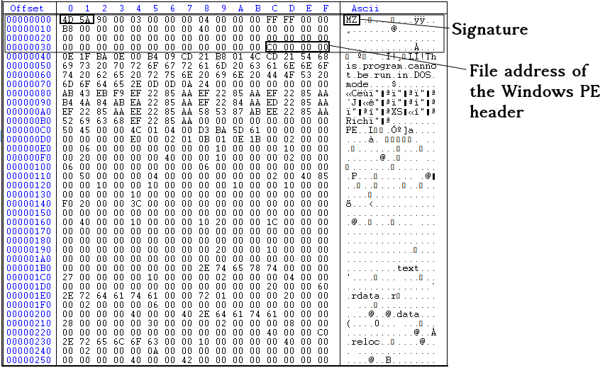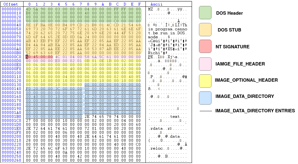 In the above image, you see the address of the PE header as 0xC0000000, but this is stored in the reverse order so the real value is 0x000000C0.