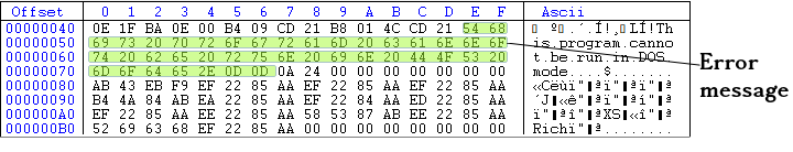 Now let's take a look at the DOS stub. Whatever between the end of the DOS header (after 64th bytes from the start of the PE fie) and before the PE header (0x000000C0) is called DOS header. This is actually a piece of executable code which can be executed in the MS-DOS environment and as we said it just print an error message in STDOUT (standard output) and exit. below, you can see the hex representation of the DOS stub section.