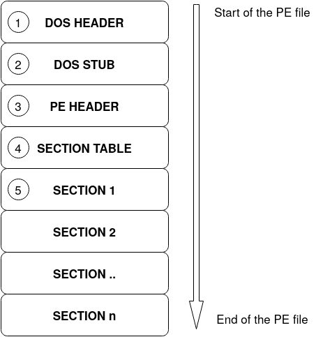 Generally, the structure of a PE file is like the image below. There are lots of other details related to a PE file but for now it's enough to know that this is the overall structure.