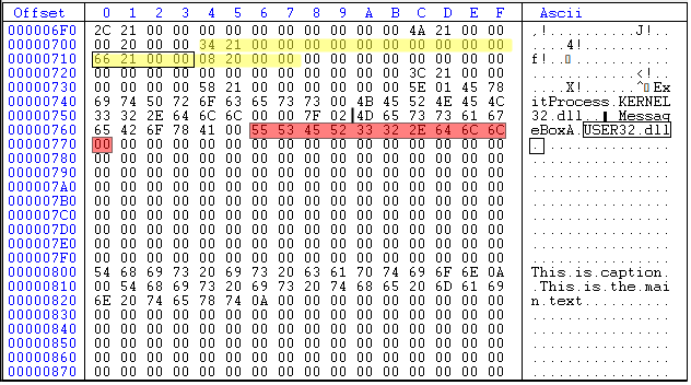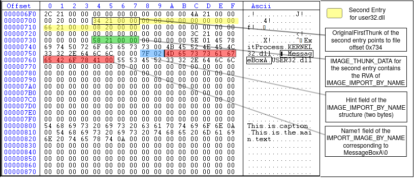 As shown in Figure 15, the import directory array has three members, two of them related to two .DLL files (user32.dll and kernel32.dll) and the last one is null to indicate the end of the array. The second entry (highlighted in yellow) is related to user32.dll and MessageBoxA function. The first four bytes of the second entry (black underline) is the OriginalFirstThunk member of the IMAGE_IMPORT_DESCRIPTOR structure. The value is 0x00002134 which is the RVA of IMAGE_THUNK_DATA array. Converting this RVA to file offset, we have 0x734 (the first element of OriginalFirstThunk array) with the value 0x00002158. Since the MSB is not set in 0x00002158, the first 31 bits of the DWORD is the RVA to IMAGE_IMPORT_BY_NAME structure. Converting the value to file offset, we have 0x758 which is the start of IMAGE_IMPORT_BY_NAME structure. The first two bytes (WORD) is the hint (0x7F, 0x02) and the rest is the null-terminated ASCII string corresponding to MessageBoxA\0 as shown in Figure 16. The second element of the OriginalFirstThunk array is NULL (DWORD starting at file offset 0x738) which means that we reached the end of the OriginalFirstThunk array (i.e., the array has only one member which is MessageBoxA. This is because we only use one function of the user32.dll).