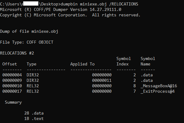 link.exe miniexe.o kernel32.lib user32.lib /OUT:miniexe.exe /entry:main /subsystem:windows /nodefaultlib