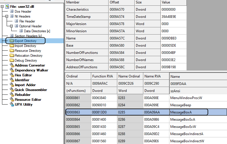 Another important entry of the DataDirectory array is called Export section. So what is export section and what it means? First, we need to know that this section is relevant to .DLL files. Dynamic Link Libraries (aka .DLLs) are modules (or libraries) in Windows operating system that contain functions and data. The functions define in a .DLL file can be used in another modules or executable files by just calling them. However, the operating system should be aware of the existence of these function before calling them. When you write a function and compile it in a .DLL file, you should define that function as Exported function and in this way the OS knows that this function is supposed to be used by another modules. Let's see an example: MessageBoxA function has been defined in user32.dll file (located in c:\windows\SysWOW64\user32.dll in 64-bit OS). If you open up the file in CFF explorer, you will see an export section on the left menu, and clicking on that shows you the list of exported functions in user32.dll. These are function that you can call from your own binary file. Look at the image below: