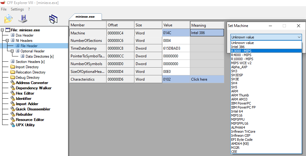 Now let's see the DOS header of our sample miniexe.exe file. Image below is the screenshot of the CFF explorer tool as part of explorer suit program that you installed: