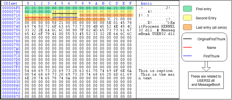 - Name1: A variable length ASCII string contains the name of the function to import. This is a null-terminated string and it's case-sensitive. If the length of the Name1+null character is an odd number, then another 0x00 will be added to align the next entry on an even boundary (for example, MessageBoxA is 11 characters + a null-terminated character = 12 bytes -> we don't need an extra 0x00 for alignment)