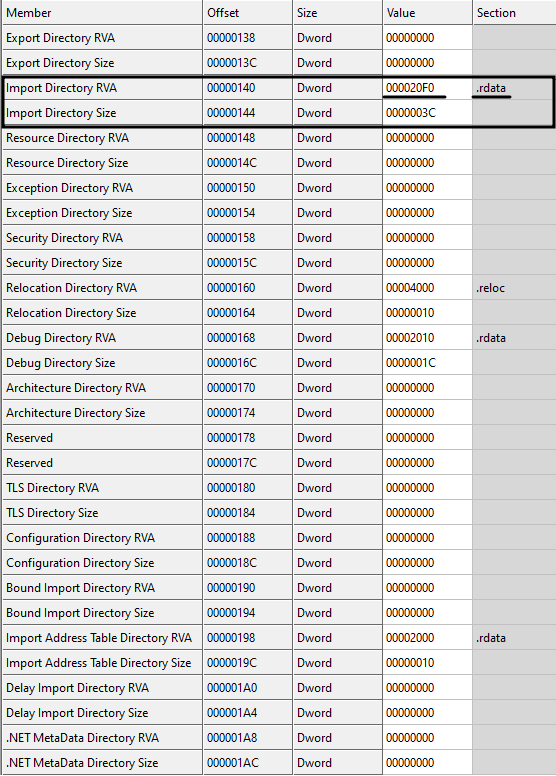 As you can see, the RVA of the import directory/section is 0x000020F0 and there is also a hint (last column of Fig. 13) which tells us that import section is part of .rdata section. However, we don't care about the names of the sections. We need to find the right section only based on address, not by the name (we already know that section's name is just a hint and anyone can change it to anything arbitrary value). Having 0x000020F0 as the relative virtual address (RVA), we check the section table (if you forgot, you can go back and read about the section table) to see this address lies in which section.