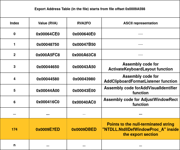 Now let's see an especial case that we talked about before: Forwarder RVA. In Figure 22, I've highlighted one entry, which is the 167th entry of ENT (with index 166). By checking figure 23, we know that the ordinal number of this entry is 0xAE (174). Now if we go to the 175th element of EAT (highlighted in Figure 24), we see that the value (0x0009E7ED) actually points to another null-terminated string which inside the export section interval. As you can see, the string is "NTDLL.NtdllDefWindowProc_A" which has the same format as forwarder RVAs as we explained above. This tells the loader that NTDLL should be also loaded into the memory.
