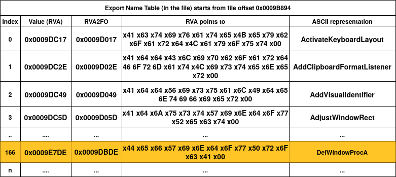 Figure 22, 23 and, 24 show the ENT, EOT and, EAT of the user32.dll file (just the first entries and one special entry highlighted in orange). Let's say the loader wants to find the RVA of the "AdjustWindowRect" function by name. The first step is to go through ENT to match the name. We can see that the forth entry of ENT has the value 0x0009DC5D and if we convert it to file offset, we get 0x0009D017 and looking at the value at this file offset, we have the matched string for "AdjustWindowRect"! Since we know that we found this match at the fourth entry of ENT (index = 3), then we get the fourth entry of EOT (EOT[3]) to get 0x06 as the ordinal number. Then, we use this ordinal number (0x06) and directly go to the seventh entry of EAT (EAT[0x06]). As you can see in figure 24, the seventh entry of EAT (with index = 6) has an RVA value of 0x000416C0 which points to the assembly code of the AdjustWindowRect function!
