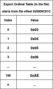 - AddressOfNameOrdinals: This is an RVA that points to a table (or array) called Export Ordinal Table (EOT).