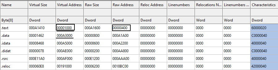 - Subtract the start of the section (specified in VirtualAddress field) from the RVA (here we need to subtract 0x00002000 from 0x000020F0)